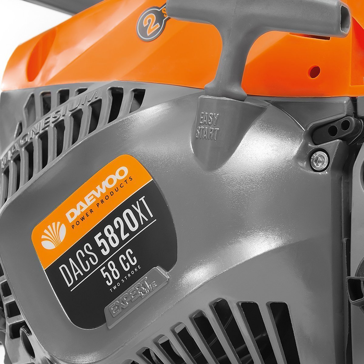 Бензиновая пила DAEWOO DACS5820XT с двигателем объемом 58 куб.см легко справится с распиливаем бревен, валкой деревьев и обрезкой сучьев. Магнезиевый стартер с системой легкого запуска Easy Start гарантирует быстрый ввод в эксплуатацию. Пила обладает антивибрационной системой, что способствует комфортной работе длительное время без негативных последствий. При нажатии на защитный щиток моментально срабатывает тормоз цепи, что гарантирует безопасность. На задней рукоятке расположен стопор рычага газа для защиты от произвольного включения.