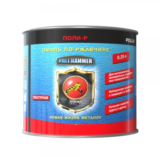 Эмаль по ржавчине Poli-Hammer обеспечивает идеальную защиту от коррозии на длительный срок и создает превосходный декоративный эффект. Применяется для окраски пластиковых, деревянных, кирпичных, бетонных и металлических оснований (изготовленных из черных, цветных и оцинкованных металлов).