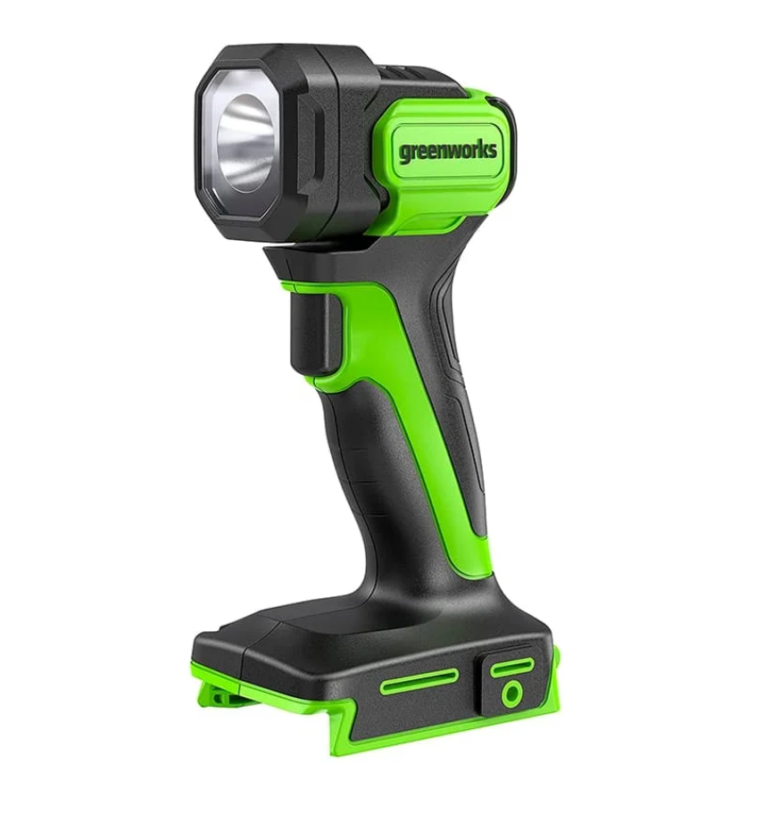 Фонарь Greenworks G24SL200 24V - фонарь из серии 24V со световым потоком 200 люмен для применения при плохом свете. Имеет 3 режима яркости, поворотную головку на 90 ° вверх, крепеж для подвешивания.