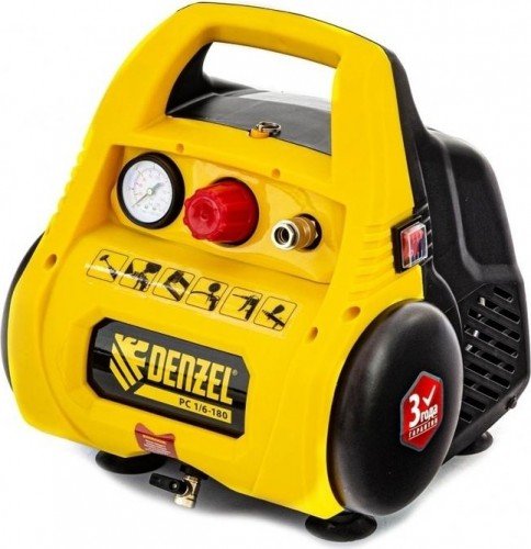 Безмасляный воздушный компрессор Denzel РС 1/6–180 оптимален для покрасочных работ, накачки шин, продувки компьютерной техники, чистки строительных инструментов. Безмасляная технология RTFE значительно упрощает работу с устройством.