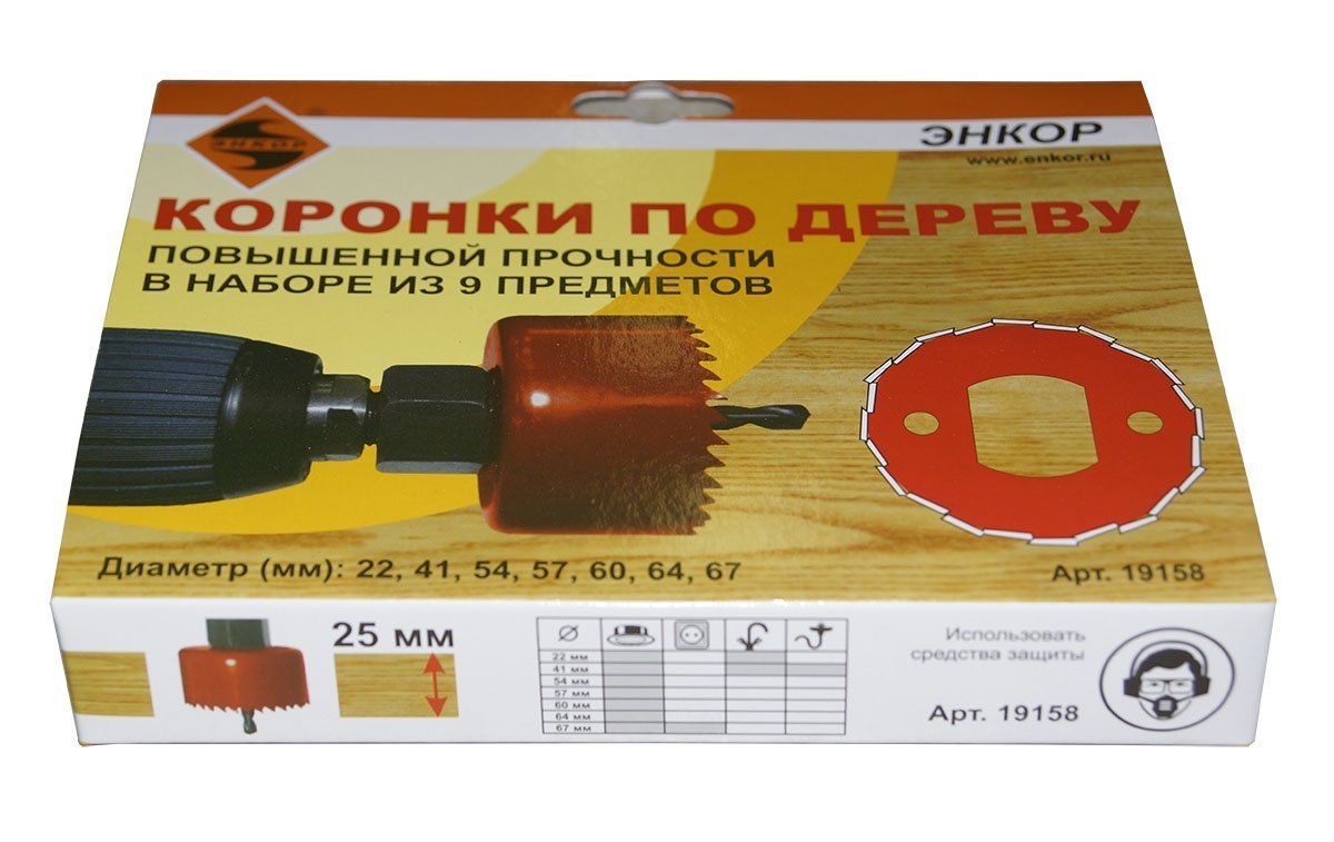 *Пожалуйста, сверяйте информацию о товаре 19158 Набор коронок по дереву Энкор 7шт+2адап с информацией на официальном сайте производителя. Внешний вид товара, его комплектация и характеристики могут изменяться производителем без предварительного уведомления.