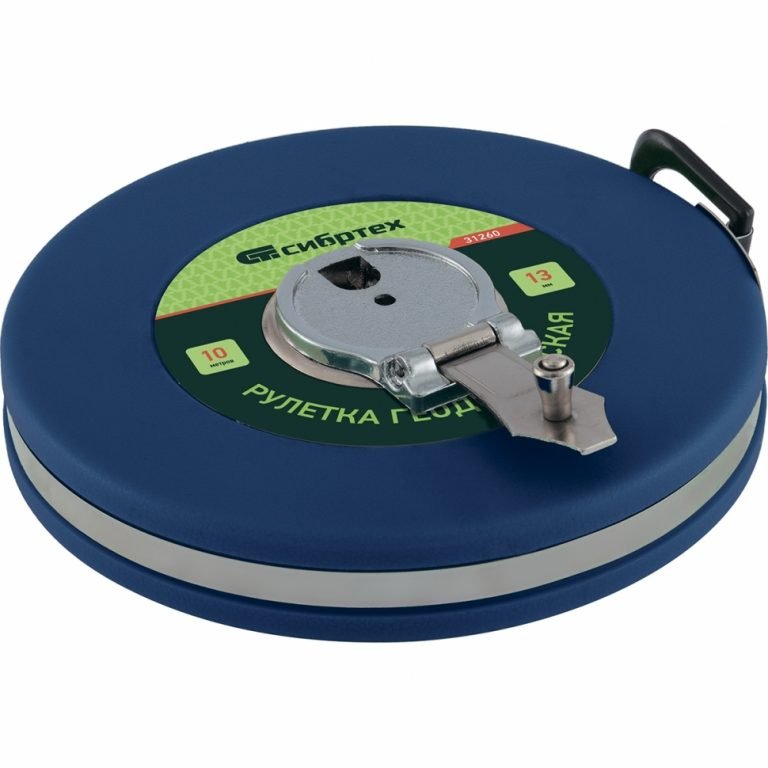 Геодезическая рулетка СИБРТЕХ 10 мх13 мм 31260 - это измерительный инструмент при проведении строительных и геодезических работ. Рулетка расположена в закрытом корпусе, изготовленном из ударопрочного АБС-пластика, усиленного стальной лентой. Механизм скручивания открывается с кнопки и расположен сбоку конструкции. Фибергласовая лента имеет на конце стальной складной зацеп.