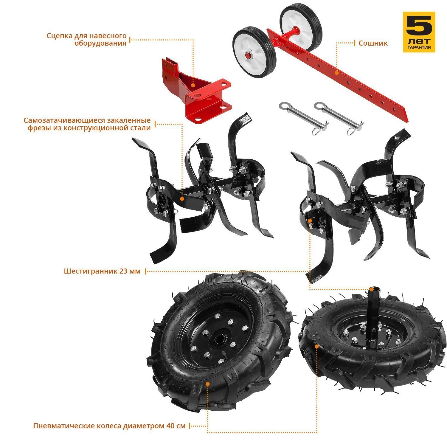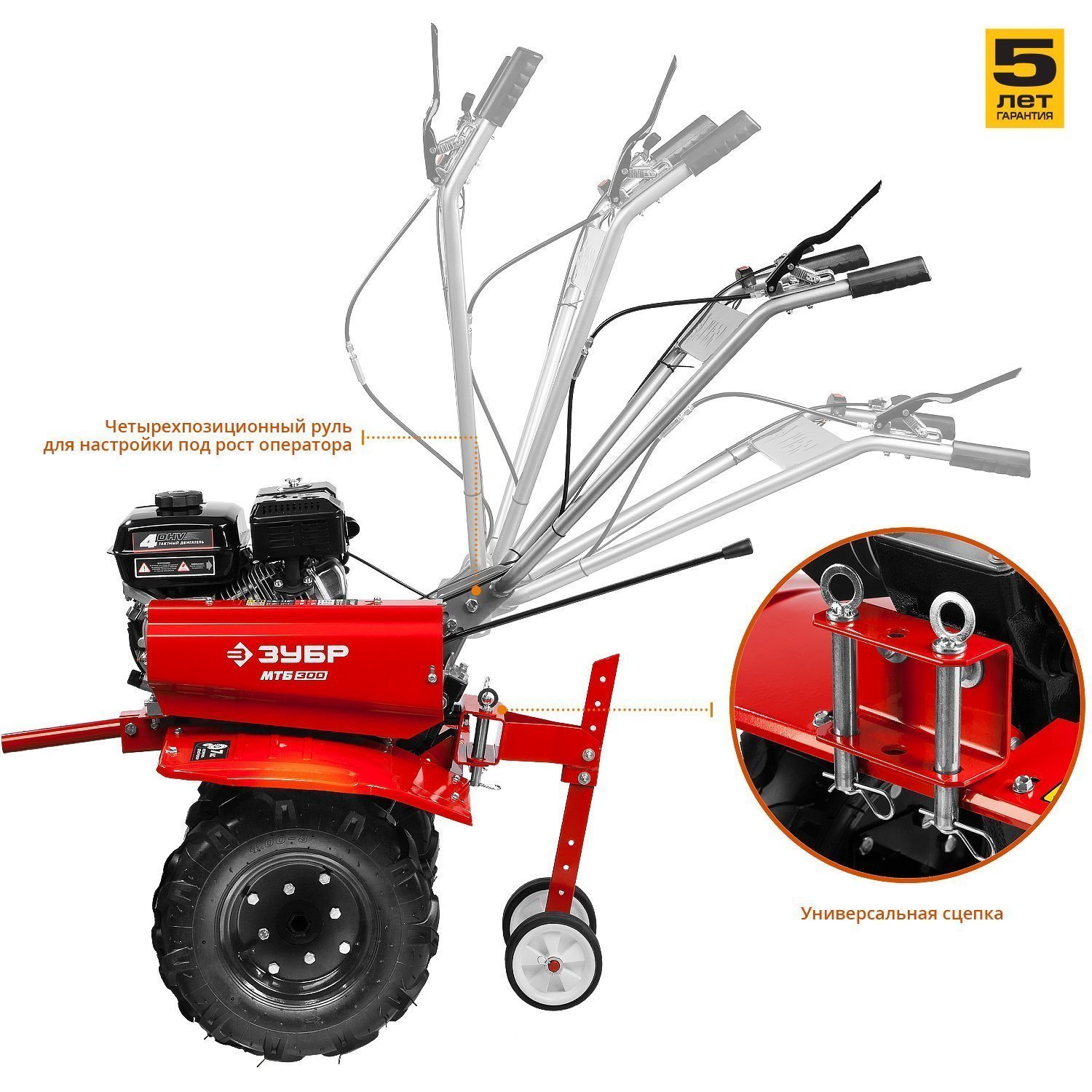 - Универсальная сцепка позволяет использовать различное навесное оборудование