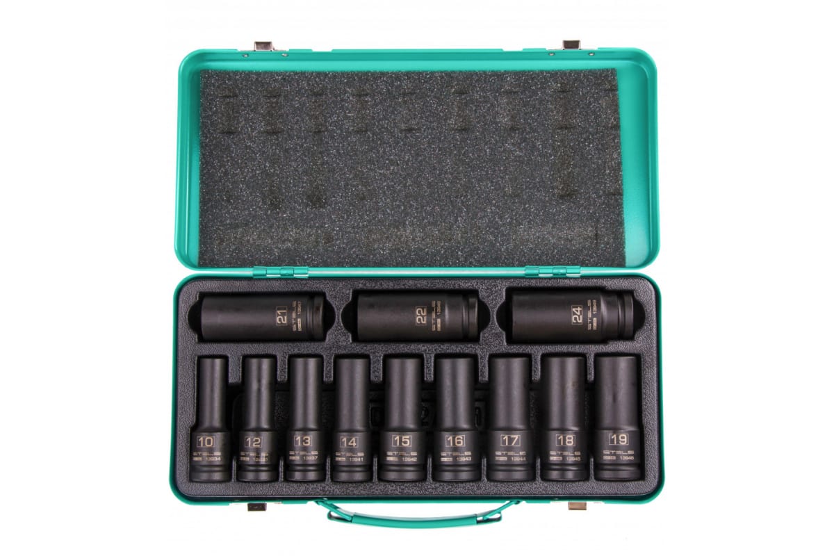 Набор ударных глубоких шестигранных торцевых головок Stels 13998 включает в себя 12 насадок размером 10-24 мм с присоединительным квадратом 1/2 дюйма. Ударные головки устанавливаются на гайковерт и выдерживают высокие динамические нагрузки, поэтому подходят для проведения строительных работ и обслуживания автомобилей.
