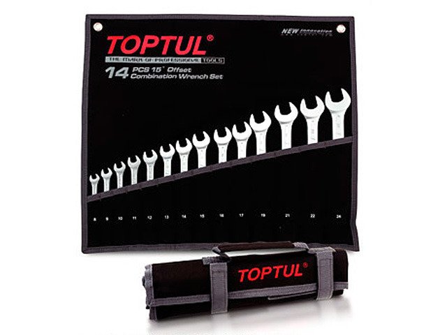 Набор ключей комбинированных TOPTUL состоит из 14 предметов размером 8, 10, 11, 12, 13, 14, 15, 17, 19, 22, 24, 27, 30 и 32 мм, имеющих окончание в виде рожкового ключа с одной стороны и окончание в виде накидного ключа с другой стороны. Инструмент упакован в удобный чехол черного цвета с отдельным карманом для каждого ключа. Чехол можно повесить на стену, а можно использовать в качестве переносной сумки. Рекомендуется для профессионального использования.
