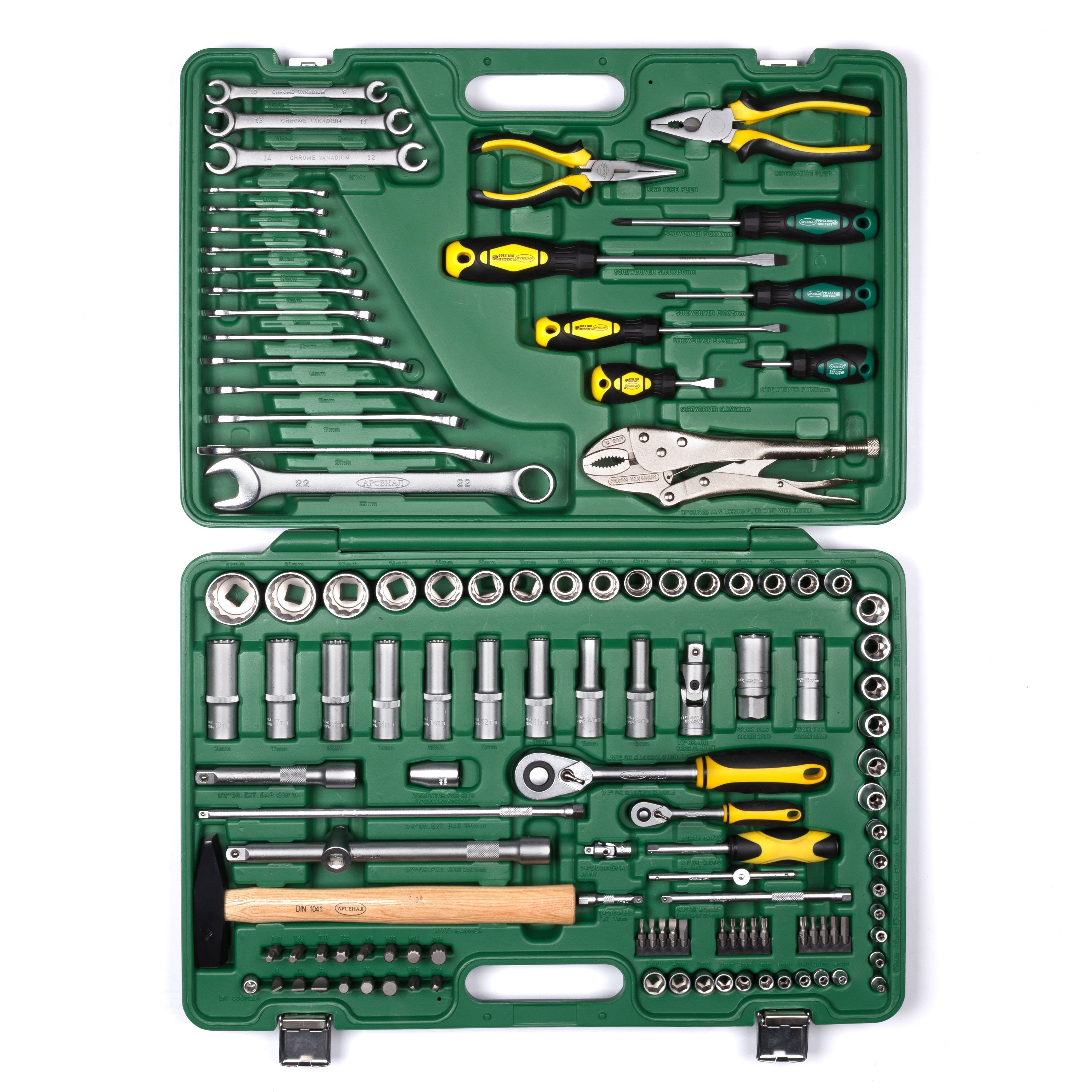 Набор инструмента из 121 предмета Арсенал AUTO 2203860 арт. AA-C1412P121 - это набор универсального автомобильного инструмента, подходящий как для профессионального использования в автосервисе, так и для самостоятельного ремонта отечественных автомобилей. Все инструменты набора изготовлены из высококачественной закаленной стали, на которую нанесено антикоррозийное покрытие, и упакованы в кейс из жесткого пластика. Это увеличивает срок эксплуатации ручного инструмента и делает удобным его хранение и транспортировку. Количество инструментов набора свидетельствует о широком круге задач, которые можно выполнить благодаря ему. Ручки всех отверток сделаны из изолирующей пластмассы с прорезиненными вкладками, исключающими соскальзывание.