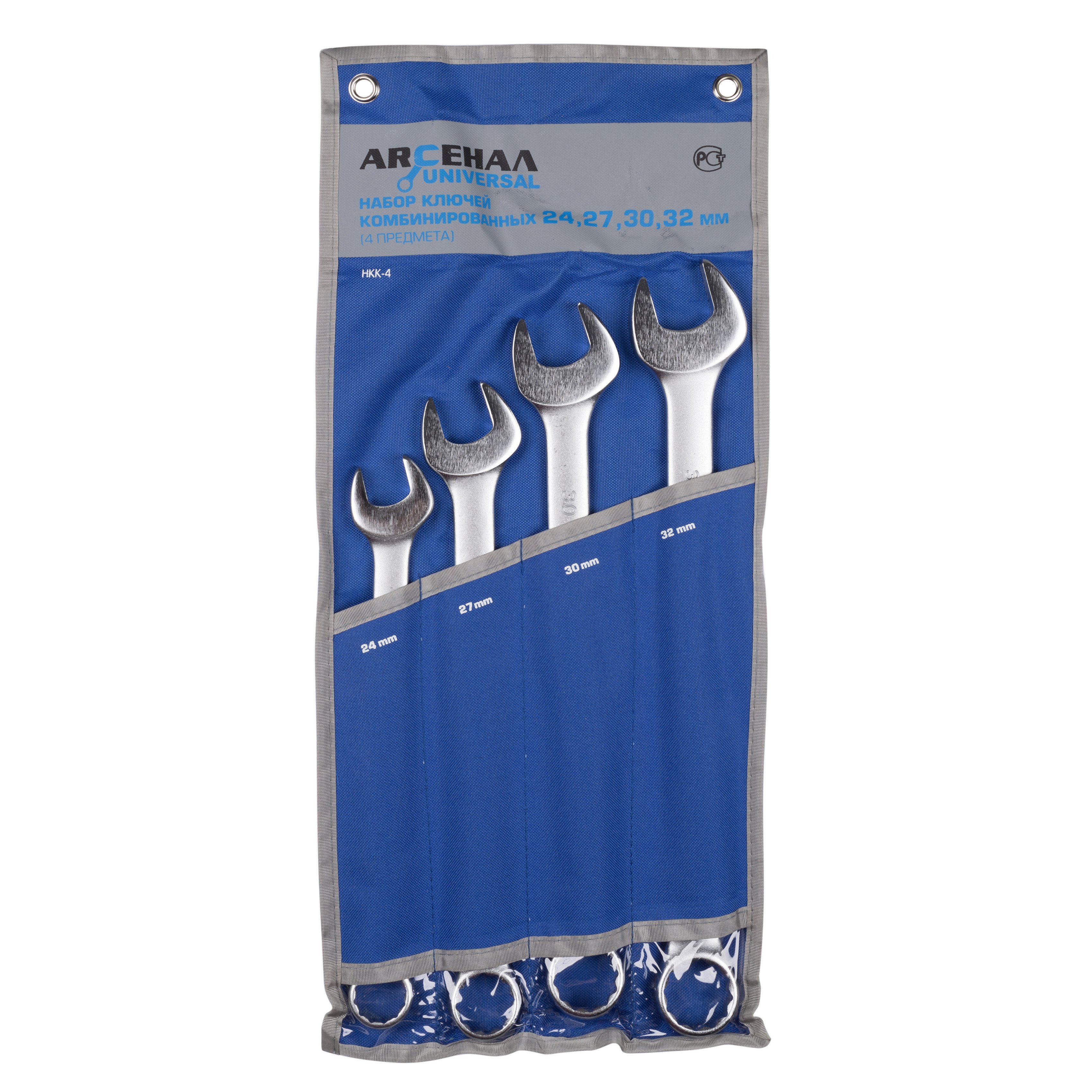 Набор комбинированных ключей Арсенал НКК-4, 37543 включает в себя четыре комбинированных ключа из высокопрочной стали, которые имеют универсальное применение. Ключи имеют двенадцатигранный профиль с одной из сторон, что увеличивает число рабочих положений. Размеры ключей: 24, 27, 30, 32 мм.