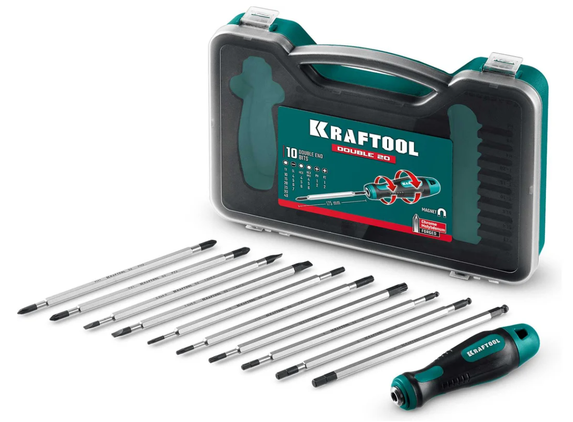 Профессиональный набор KRAFTOOL с высокопрочными Cr-Mo стержнями. Переставная отвертка надежно удерживает стержни и позволяет применять максимальные усилия при работе