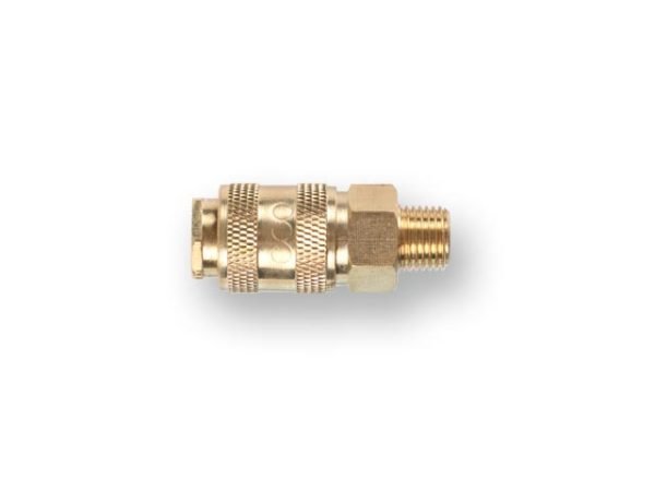 Соединение быстросъемное МАМА х наружная резьба G1/4″ ECO имеет автоматический клапан, перекрывающий канал и предназначено для установки на выходном конце различных элементов пневмосистемы для создания автоматических прерывателей подачи воздуха. Латунный корпус исключает возможность появления коррозии.