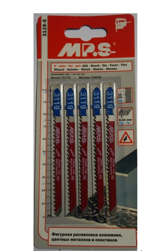 Пилки HSS MPS 3119 используются для фигурного распила алюминия, стеклопластика толщиной 2-20 мм с помощью электролобзика. Выполнены из качественных материалов, имеют длительный срок эксплуатации.