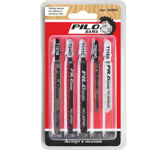 Набор пилок 5 шт по дереву и металлу T101B, T101AO, T111C, T244D,T118A Pilorama 560005 включает самые популярные модели пилок для электролобзика для чистого, быстрого, грубого и фигурного распила древесины и пилку для пиления металла.