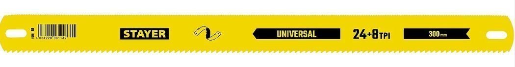 Полотна двойные широкие для ножовок по дереву и металлу Stayer Universal - сменные полотна изготовленные из высокоуглеродистой стали с различным количеством зубьев для пиления деталей и заготовок из различных материалов.