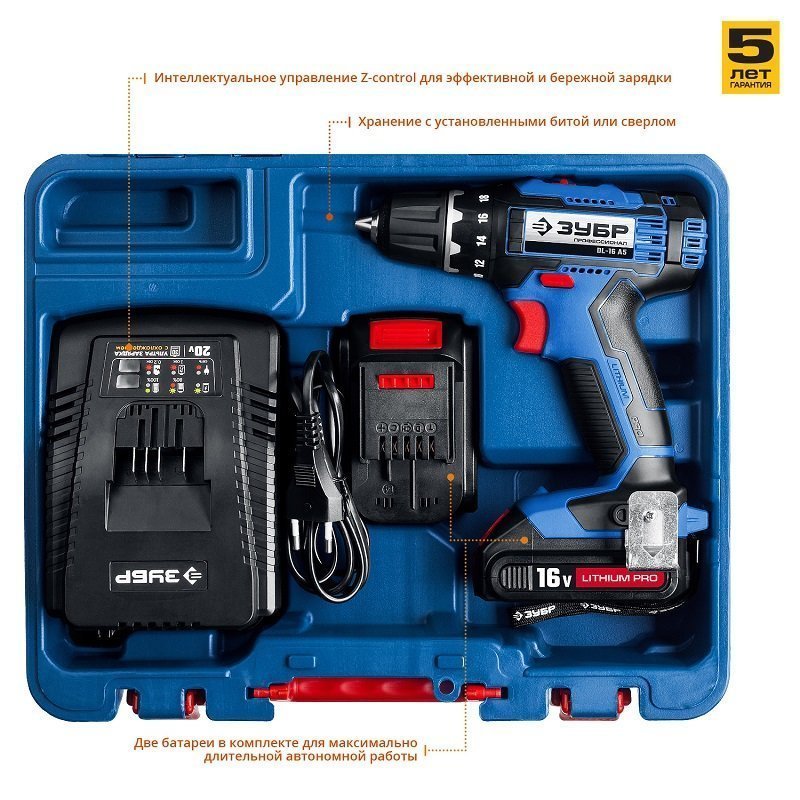 Аккумуляторная дрель-шуруповерт 2 АКБ ЗУБР ПРОФИ DL-16 A5