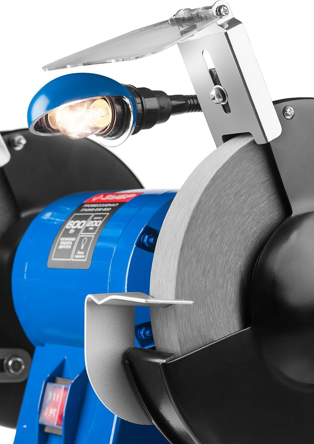 Станок улучшенной конструкции ЗТШМЭ-200-600 Зубр, с мощным двигателем и подсветкой рабочего места - специально для профессионалов. Применяется для заточки и сухой шлифовки металлических заготовок и режущего инструмента.