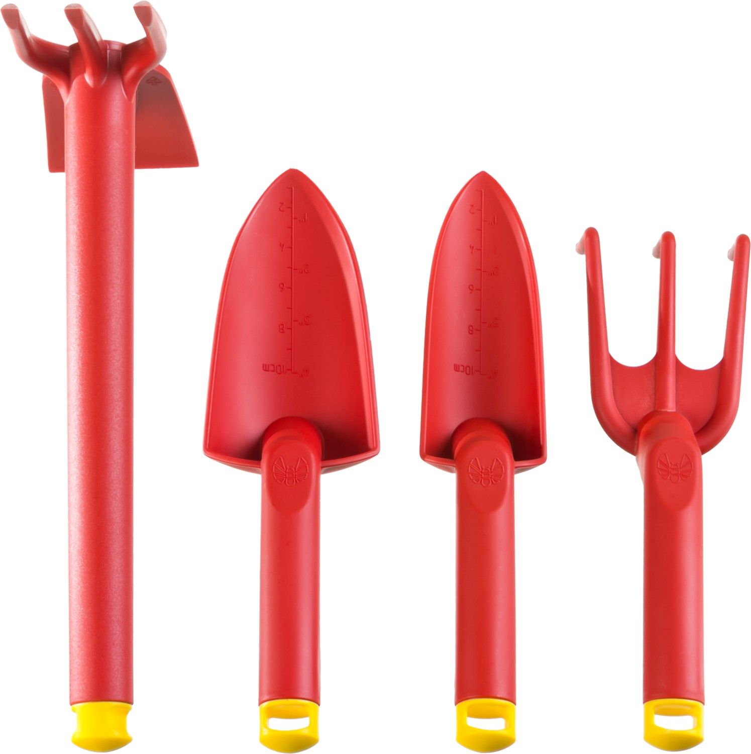 В наборе: широкий посадочный совок, узкий посадочный совок, рыхлитель, мотыга-рыхлитель