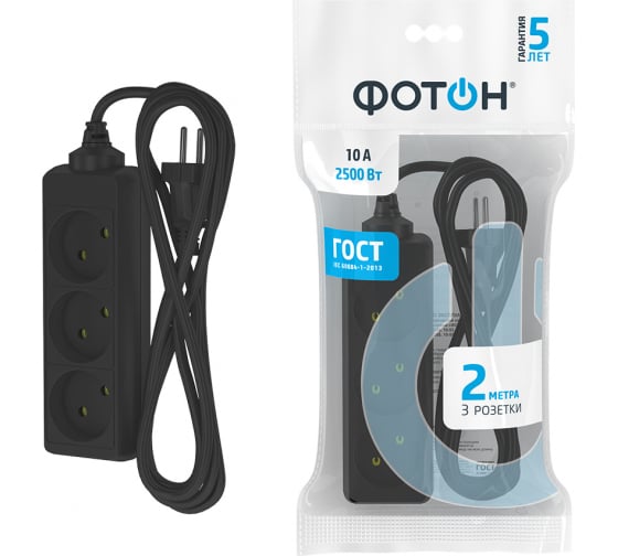 *Пожалуйста, сверяйте информацию о товаре 22718 Удлинитель сетевой "Фотон" 10-23, 2м, 3 розетки, 10А, черный с информацией на официальном сайте производителя. Внешний вид товара, его комплектация и характеристики могут изменяться производителем без предварительного уведомления.