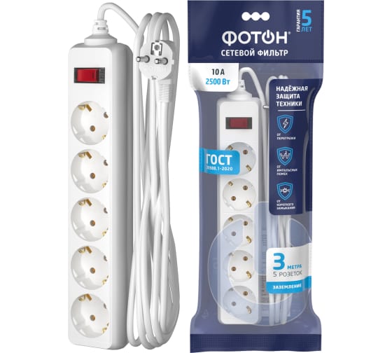 Сетевой фильтр ФОТОН предназначен для подключения нескольких электроприборов и их защиты от перегрузки, короткого замыкания и импульсных помех. Обеспечивает необходимую защиту бытовой, офисной и компьютерной техники.