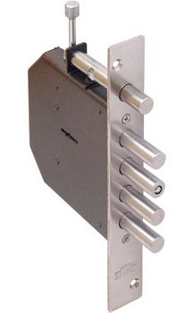 4 никелевых ригеля. Задвижка-затвор. 4 класс ГОСТ 5089. Во всех замках БАЗАЛЬТ, имеющих встроенную задвижку, при полностью выдвинутом стержне задвижки блокируется сувальдный механизм замка, исключая возможность открытия замка с наружной стороны ключом.